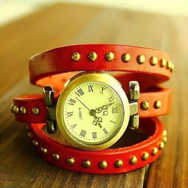 This Hot selling women Bella Chic watches and bracelet is a stunning, trendy and unique design piece. The watch centres on a studded and double-wrapped leather band, which doubles as a bracelet and a wrist watch. Comes in 4 colours (orange, brown, green, red ).
