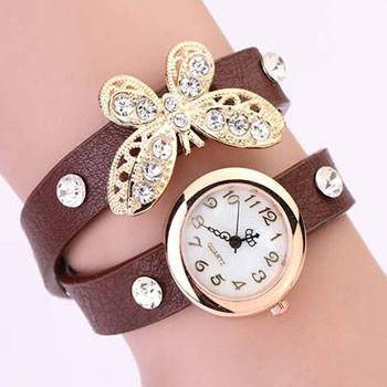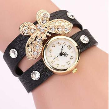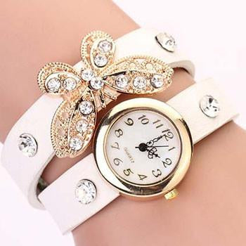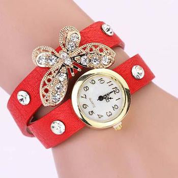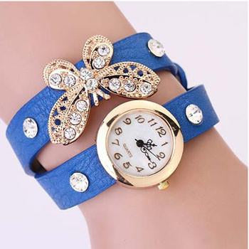 This gold plated butterfly with diamond Inspired Ladies Leather Watch is a stunning piece. It's made from handcrafted genuine leather. If you want that all people have the attention towards you then add this beautiful piece to your collection today! While stocks last! Comes in Black, pink, blue, brown, red, white colors.